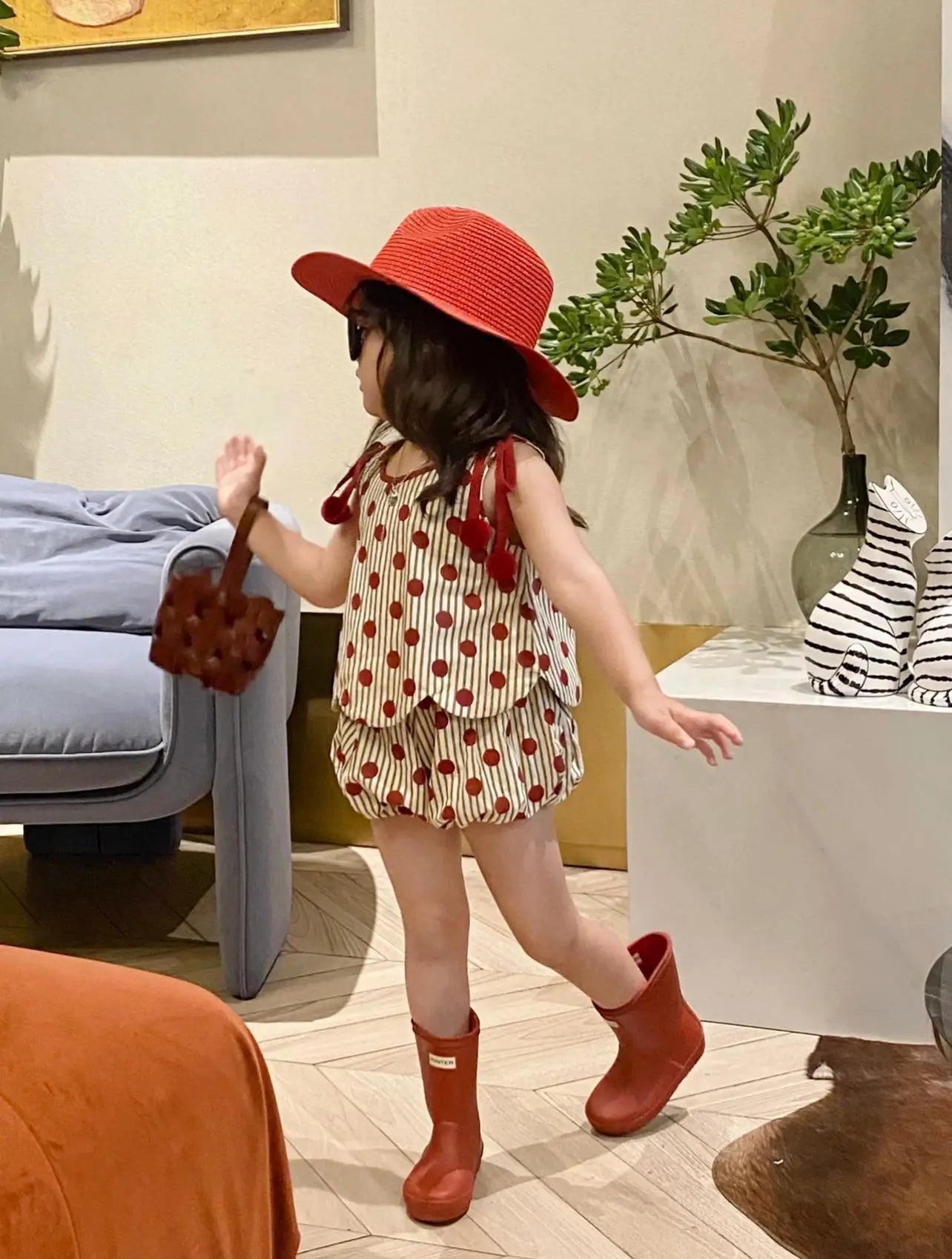 With sizes ranging from 13-36 months and up to 6 years, the Angela Wonder Summer Girls Dotted Two Piece Suspender Shorts Set is a versatile option for your child's wardrobe. Made of 100% cotton, this set is designed for both style and comfort, and features a polka dot pattern that is perfect for the summer season. With no closures and an O-neck collar, your child can easily put on and take off this set without fuss. Plus, the sleeveless and regular sleeve design make it ideal for warmer weather.
